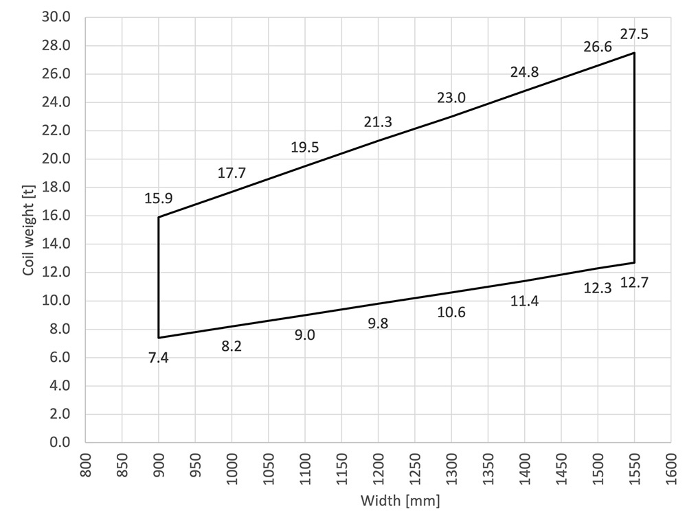 Coil outside diameter range (mm) : 1370 mm to 1870 mm depending on coil weight.